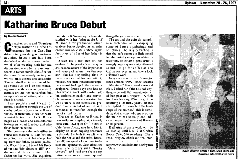 The art of Katharine Bruce is presently on display at a trendy book café. Owner of Griffin Books Café, Sean Cheop, says he'd like to display art as an ongoing showcase in the café. He feels it compliments both the venue and the artist. Bruce, herself, has spent a lot of time in the café and approached Sean about the idea. She prefers such "funky venues" and said she feels such intimate venues are more special than galleries or museums.