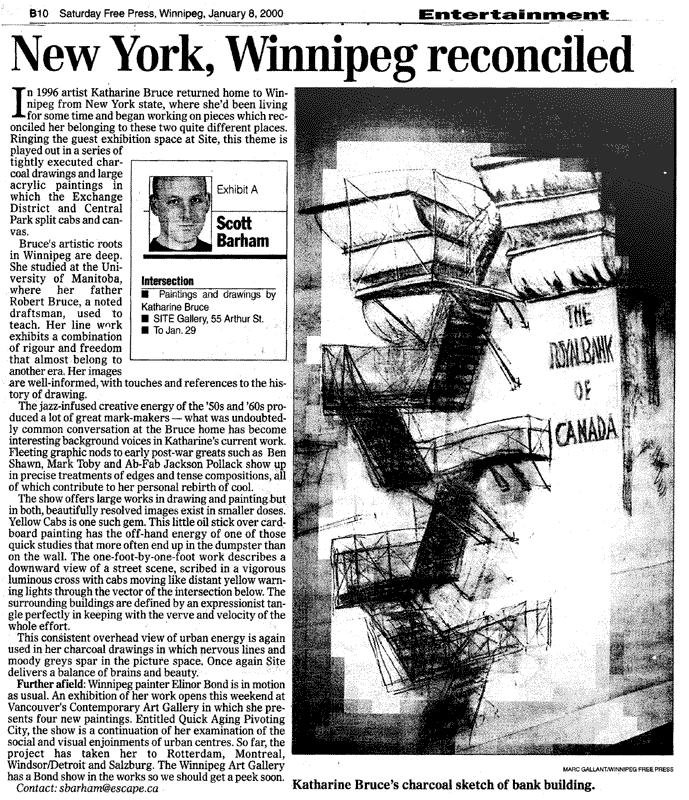 A prodigal's return to Winnipeg propels the city's first arts event of the millennium. On January 1, 2000 at 2:00 p.m. at Gallery, 55 Arthur Street, visual artist Katharine Bruce opens INTERSECTION, her exhibition of recent paintings and drawings. The opening reception with the artist will be held at the Gallery between 2:00 and 5:00 p.m. The work explores urban themes and city scenes from Bruce's two significant residences, New York City and Winnipeg.