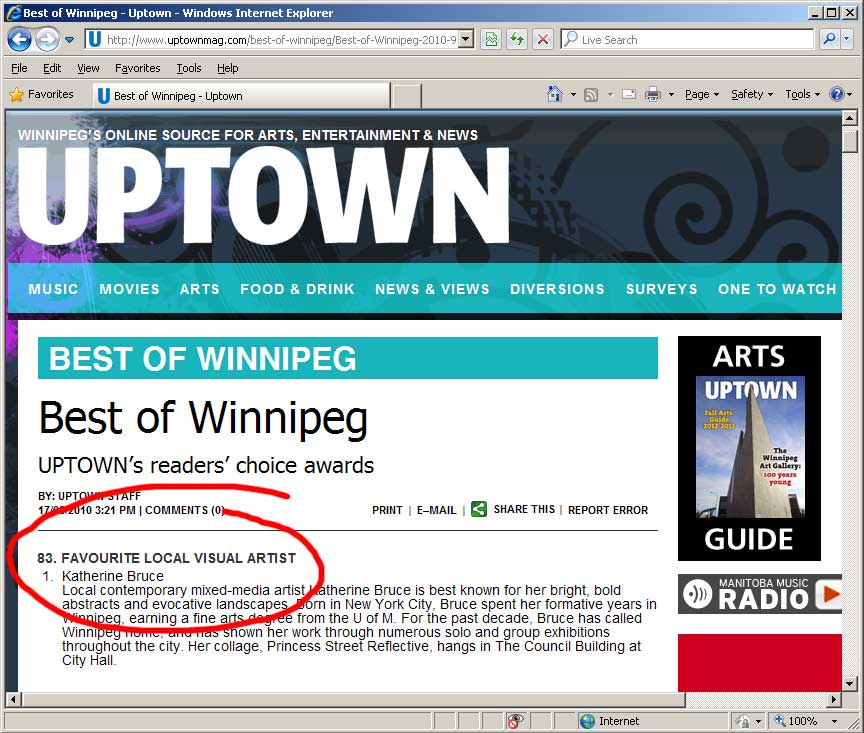 Uptown Magazine's annual "Best of Winnipeg" survey is a group effort. Each year, Winnipeggers are given the opportunity to sound off about the people and places that make Winnipeg cool. After the official count is finished, the top finishers are contacted, congratulated and photographed by an Uptown photographer. At last, the job is complete and 2010's list is before you. Uptown says that the results of this year’s Best of Winnipeg readers' choice survey are sure to generate some lively debate - this is as much your baby as it is theirs. Whether you agree or disagree, this survey reflects your opinions about the city we all call home. Here's what Uptown had to say about Katharine: "Local contemporary mixed-media artist Katherine Bruce is best known for her bright, bold abstracts and evocative landscapes. Born in New York City, Bruce spent her formative years in Winnipeg, earning a fine arts degree from the U of M. For the past decade, Bruce has called Winnipeg home, and has shown her work through numerous solo and group exhibitions throughout the city. Her collage, Princess Street Reflective, hangs in The Council Building at City Hall."